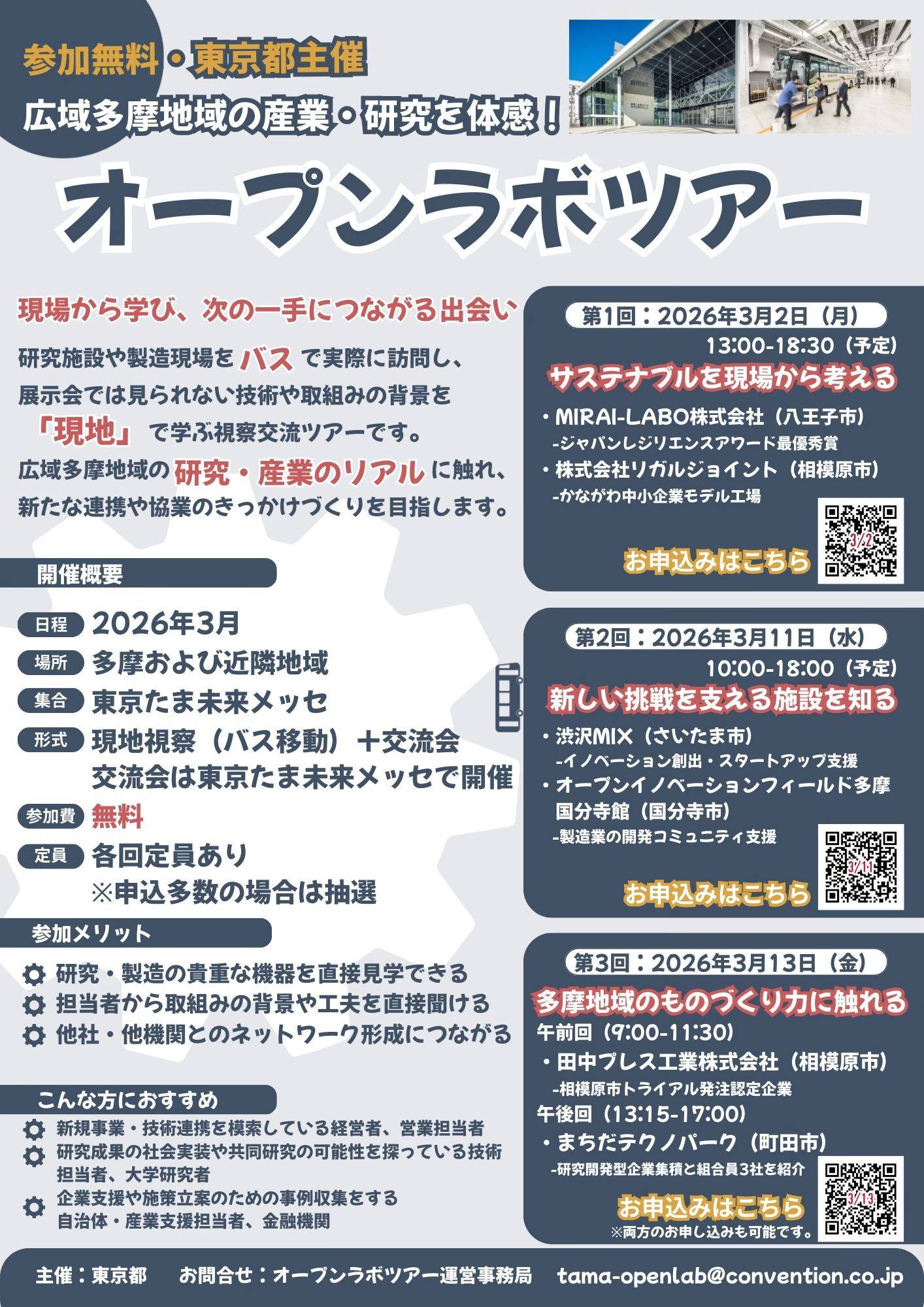 本ツアーは広域多摩地域に所在する企業やインキュベーション施設をバスで訪問し、展示会では見られない現場の技術・開発背景を直接ご覧いただけるプログラムです。