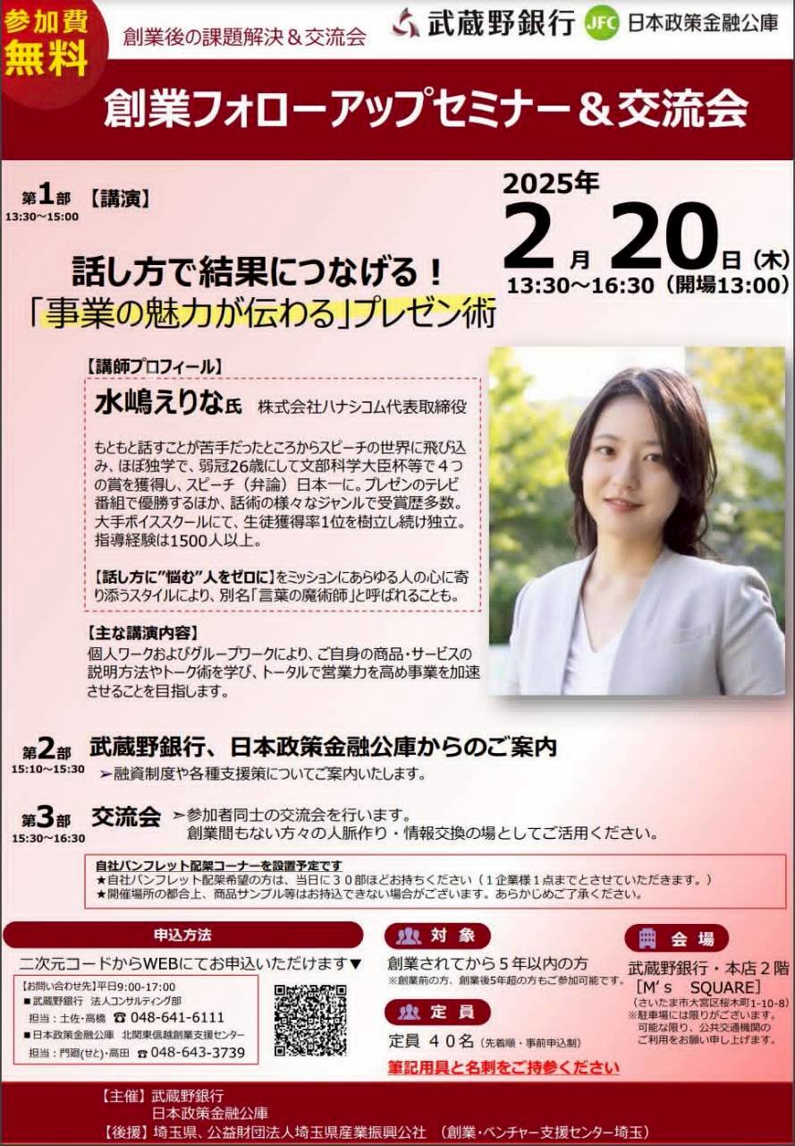 代表の水嶋が、武蔵野銀行さま、日本政策金融公庫さま主催の「創業フォローアップセミナー」にて講演講師を務めました。